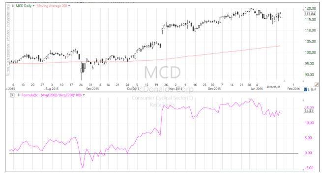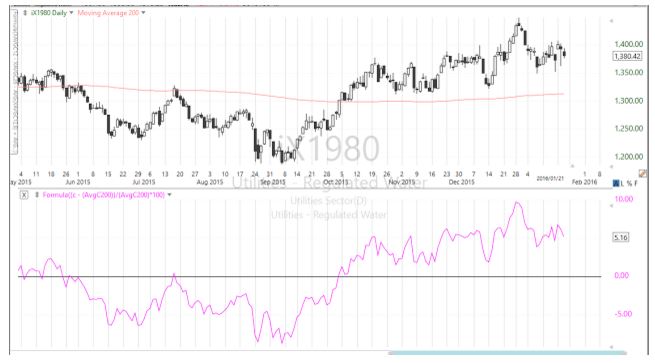 木曜のマーケットがそろそろ終了します。下はS&P500指数の日足チャートです。 陽線で終了となりますが、見てのとおり上ヒゲ(1)が目立ち、強さを表すローソク足ではありません。昨日は下ヒゲが極めて長い強気なローソク足でしたが、期待されたような力強いラリーは、残念ながら今日のマーケットでは起きませんでした。 入れた指標は乖離率です。現在の数値はマイナス8.71%を示し(A)、S&P500指数が200日移動平均線から8.71%下へ離れていることを表わしています。位置的には安値をつけた8月(B)、9月(C)とほぼ同レベルであり、平均への回帰ということを考えると、短期反発ラリーが起きてもおかしくないレベルです。 もちろん、乖離率だけを見てマーケットは反発する、と断言することはできません。どんなにS&P500指数が移動平均線から大きく離れていても、原油や中国株式市場が更に大きく下げてしまえば、乖離率に関係なくS&P500指数も下げてしまいます。 米国株式市場は既にベアマーケットに入ったという見方が広がり、投資家たちは、株を保有し続けることに大きな不安を感じていますが全ての株が売られている訳ではありません。こんな不安定なマーケットですが、乖離率を見ることで、資金がどの株へ避難しているかを把握することができます。好例はダウ銘柄のマクドナルドです。 現在の数値は14.31%のプラス乖離です。マクドナルドの株価は200日移動平均線から上へ14.31%離れ、チャートが明確に示すように株価に崩れはありません。ファストフードの最大手、世界でビジネスを展開するマクドナルドは、明らかに資金の避難場所となっています。 業種別に見た場合、プラス乖離が最も大きいのは公益株である水道事業株指数です。 見てのとおり、値動きに崩れはありません。水は生活に欠かすことができないものですから、水道事業株が避難先として選ばれるのは十分に納得できます。現在の乖離率は+5.16%です。 乖離率で判断した場合、資金が大きく流出しているのは海運株です。 上は海運株指数ですが、45.09%という極めて大きなマイナス乖離となっています。世界経済の低迷、特に中国経済の減速がこの業種の不振原因となっている訳ですが、海運に関するこんな報道があります。 タンカーを一日借りる方がフェラーリを借りるより安い 中国の経済成長減速が、貨物船のレンタル料金を暴落させた。1100フィート・クラス(約335メートル)の貨物船のレンタル料金は一日1563ドル、しかしフェラーリF40は5597ドルだ。(ゼロヘッジ) 巨大なタンカーを借りる方が安いというのですから、これはあまりにも極端な話です。だからここが海運株の底だ、と結論はしませんが、将来的な買い候補として海運株をリストに入れておこうと思います。 (参照した記事: It Is Now Cheaper To Rent A Dry Bulk Tanker Than A Ferrari)