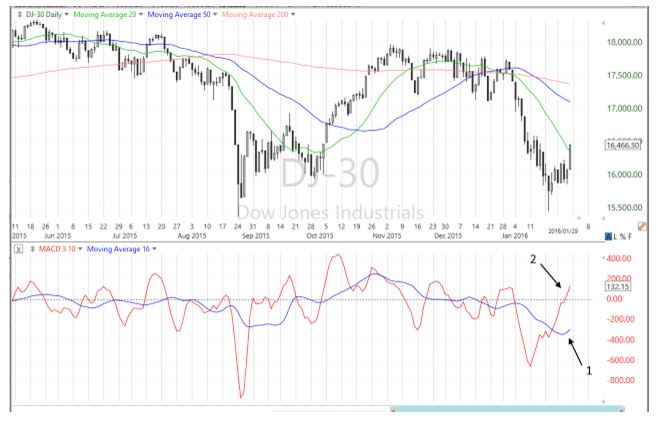 金曜のマーケットが終了しました。言うまでもなく、今日一番の話題は「日銀のマイナス金利導入」です。この驚きの措置に株は迅速に反応し、世界の株式市場は大幅上昇となりました。 世界の株式市場が大きく跳ね上がり、ビシネス・インサイダーは、こんな写真を掲載しています。 さて、ここで水をさすような、つならないことを一つ挙げます。下は、ダウ平均の日足チャートです。 注目はMACDです。パラメーターは3、10、16に設定してあります。リンダ・ラシュキ氏が有名にした3/10オシレーターですが、シグナルライン(1)とMACDライン(2)の位置を見てください。 シグナルラインはゼロライン(点線)より下にあり、これはダウ平均が売り基調にあることが示されています。今日のダウの大幅上昇で、今までゼロラインより下にあったMACDラインがゼロラインの上に復帰しました。これが意味するのは、空売りチャンスの到来です。 もちろん、今直ぐ空売れという意味ではなく、3/10オシレーターから発せられているメッセージは「空売りの準備をせよ」です。空売りのタイミングのつかみ方は、トレーダーによってまちまちです。ある人はローソク足のパターンからシグナルを得、あるトレーダーはストキャスティクスやRSIから買われすぎシグナルが出るのを待ちます。 空売りの湿った話はやめて、ツイッターで今日見つけた面白いツイートを最後に紹介したいと思います。 「息子が幸せそうに眠っているのは当たり前だよ。この子の今日までの人生は上げ相場の中で育ったのだから。」 (情報源:STOCKS SOAR: Here's what you need to know ツイート)