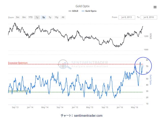 約1年前、ジェイソン・ズワイグ氏は、「金はペット・ロック(ペット石)である」、という記事をウォール・ストリート・ジャーナルに発表しました。 その後、金は20%の大幅上昇となり、ズワイグ氏は先週、こんなことを述べています。 「ズワイグはバカだ」、と思っているのは、あなた一人だけではない。私も、同様なことを考えていたところだ。 ズワイグ氏は敗北を認めたな、と思ったのですが、どうやらそうではないようです。負け惜しみのようにも聞こえますが、氏は短期的な値動きだけを見て、投資判断が間違っていたと判断するのは誤りである、と語っています。もちろん、この考え方はデイトレーダーや、数日間だけ株を保有するスイング・トレーダーにはあてはまりません。 一例として、ズワイグ氏は、アップル株を挙げています。 2001年10月、iPod発売開始の報道を聞いてアップル株を買った人は、直ぐに利益を上げることはできなかった。現に、アップル株は1年間で25%の下落となった。短期的な値動きだけで判断すれば、アップル買いは間違っていたことになるが、長期的な視野を持って投資した人の見方は正解であり、アップル株は7900%の上昇となった。 金が、もし本当にペット・ロックであるのなら、この1年間で達成した20%の上昇は間違いである、と結論することができます。下は、ズワイグ氏の説明の要点です。 金はいざという時の保険である、と一般的に解釈されている。英国は国民投票でEU離脱を決め、世界の中央銀行は経済を好転させることに四苦八苦し、世界には現在12兆ドルに及ぶマイナス利回りの国債が存在し、明らかに今日の社会は混乱している。 2008年10月、世界が金融危機のまっただ中にいた頃、金価格は今日より30%低かった。2011年8月、スタンダード&プアーズ社が米国のクレジットを格下げした時の金価格は、現在より40%高かった。今日の世界の不安は、金融危機の時より悪いだろうか?2011年の夏は、現在より暗い状態だっただろうか? 投資家たちは今日、世界情勢が更に悪くなることを確信し、金が万能薬であることを疑わずに金を買っている。現に、今年前半で金のETFに流れ込んだ新規資金は122億ドルにのぼり、米株のETFに流入した資金を上回っている。 過去と全く同じことが繰り返されることはない。しかし、金がここから更に大幅上昇することは前例に従わないだけでなく、前例を破ることになる。私はバカだろうか?私は多くのことに関して間違った見方をしていたことは認めるが、金に関しては間違っていないと思う。 投資心理という面から見た場合、大衆は金に対して極めて強気です。 円で囲いましたが、金に対する強気は、最近3年間で見たことのない高レベルに達しています。ドイツ銀行が破綻し、世界に恐慌がやってくるなどといった予想も頻繁に聞かれ、投資家たちは最悪な事態に備えています。 その一方、賢い資金と呼ばれるヘッジャーたちは、ほぼ史上最高に匹敵する金の空売りポジションを抱えています(矢印の部分)。「人の行く裏に道あり花の山」、という相場の格言に従うなら、ここからの金の買いは要注意です。 (参照した記事:Gold: It’s Still a Pet Rock)