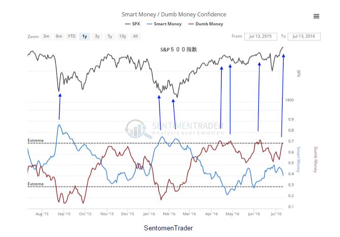 具体的な数字はありませんが、弱気論をツイートする人が減ったように思います。米国株式市場は史上最高値を記録し、悲観的なツイートが目立たなくなりました。英国の国民投票でEU離脱が決まった時は、まるで世の終わりが来たといった雰囲気でしたが、あれは良い買い機会であった、と人々の態度は豹変です。 正に、投資心理が大きく変わった、センチメントが180度転換した訳ですが、SentimenTraderという投資心理専門の有料サイトがあります。私がこのサイトを購読するようになったのは、好きなアナリスト、リズ・アン・ソンダース氏がこのサイトを勧めていたからです。 投資心理を表す格言として有名なのは、これです。 野も山もみな一面に弱気なら、阿呆になりて米を買うべし 皆が強気な時は、株価は過熱していますから深追いするべきではありません。反対に皆が揃って弱気なら、株価は既に冷え込み底の可能性がありますから、こんな時こそ買うべきです。言うことは簡単ですが、これを実行するのは中々難しいです。 SentomenTraderで面白いのは、スマートマネー(賢い資金)とダムマネー(愚かな資金)の強気度を示す、Smart Money / Dumb Money Confidenceという指標です。下が最近1年間の動きです。 赤い線が愚かな資金の心理、青い線が賢い資金の心理です。0.7を超えると強気、0.3以下は弱気を示します。矢印を入れましたが、S&P500指数の底付近で強気になっているのは賢い資金です。そして、天井付近では愚かな資金が強気になっています。言い換えると、資金の少ない一般投資家はマーケットの天井で強気になる傾向があり、悲観的なニュースが多い底付近で買っているのはプロと呼ばれるヘッジャーたちです。 一番右側、現在の様子を見てください。S&P500指数は高値を更新し、強気なのは愚かな資金です。もちろん、このチャートに従ってトレードすれば必ず儲かる、ということではありません。愚かな資金が強気になってもマーケットは直ぐには下げません。そして、賢い資金が強気になっても、マーケットは即上昇に転じることはありません。しかし、両者の動向を見ることで、現在は積極的に買うべきなのか、それとも買いは控えるべきかが分かります。 (情報源:SentomenTrader)