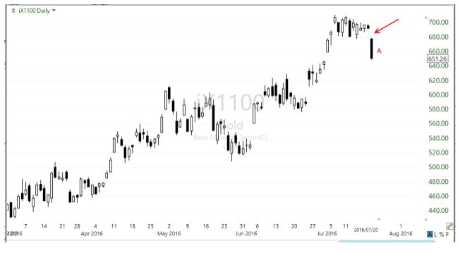 水曜のニューヨーク株式市場で、一番気になったのは、このチャートです。 金鉱株指数の日足チャートです。矢印で示しましたが、窓を開けて寄付き、目立つ長い陰線(A)を形成して終了となりました(-5.93%)。アップトレンドはまだ崩れていませんが、気になることを二つ挙げます。 多くの人たちはブルフラッグが形成されている、と解釈していましたから、期待していたことは上放れです。しかし見てとおり、今日起きたのは正反対のブレイクダウンですから、上放れを期待して既に買っていた人は慌てます。思惑が完全に外れた訳ですから、フラッグを下放れた時点で損切るしかありません。 金鉱株指数は40の銘柄で形成されていますが、今日の取引で上昇した銘柄は一つも無いのです。 上が、金鉱株指数を構成している銘柄リストです。(影が付いている部分は金鉱株指数。)唯一下げなかったのは、一番上に記されているSolitario、今日の結果は±0です。それ以外は全て下げ、Tanzanian Royaltyは14.52%も下げています。 米国株式市場で最も有名なのはダウ平均です。ダウは30銘柄で構成されていますが、全ての銘柄が下げて終了する、ということは滅多に起きません。要するに、滅多に起きないことが今日の金鉱株指数に起きました。正に、無差別に売られたという様相ですから、金鉱株から資金の引き上げが始まった可能性があります。明日からの金鉱株の動きに注目です。