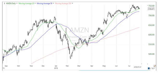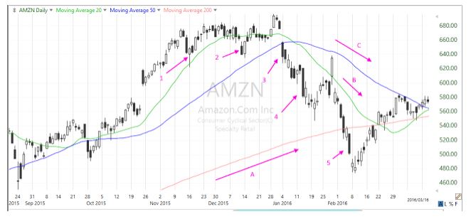 多くのトレーダーが移動平均線を使っています。「私はファンダメンタルズを重要視しているから滅多にチャートは見ない」、と言う人でさえ移動平均線を利用しています。トレンドを把握する、レジスタンスやサポートの位置を確認する、売買タイミングに利用する、と移動平均線には様々な利点があります。 下は、アマゾンの日足チャートに3本の移動平均線を入れたものです。 緑の線は短期トレンドを表す20日移動平均線、青は中期トレンドを示す50日移動平均線、そして赤は長期トレンドを示す200日移動平均線です。現時点では3本が揃って上昇していますから、買いが基本的な姿勢です。 しかし、こんな事がよく起きます。 株価が上昇する20日移動平均線から跳ね返るのを見て、Yさんは、1でアマゾンを買いました。2で株価は20日移動平均線を割りましたが、損切りはしませんでした。3では50日移動平均線割れが起きましたが、そこでも損切りをしませんでした。4では巨大な陰線が現れ、BとCの矢印で分かるように、20日と50日移動平均線は明確に下げています。しかし、そこでも損切りはしませんでした。なぜなら、200日移動平均線は上昇が続き(A)、長期アップトレンドに変化は無いからです。それに、200日移動平均線がサポートになる可能性もあります。しかし、株価が200日移動平均線を決定的に割った日(5)、Yさんはアマゾンをとうとう売って損切りです。 多くの人たちが、Yさんのような間違いを犯します。損切り価格を、あらかじめ決めていなかったのが悪い、と言ってしまえばそれまでですが、極端な言い方をすると、3本も移動平均線を使ったのが損切りが遅れた原因です。 アマゾンを買った理由は、株価が短期トレンドを示す20日移動平均線から跳ね返ったからです。言い換えると、短期的な指標を利用して買いを実行した訳ですから、短期的な条件が崩れた20日移動平均線割れ(2)で、直ぐに損切るべきです。 しかし、Yさんのチャートには中期トレンドを示す50日移動平均線、それに長期トレンドを表す200日移動平均線も入っていますから、損切りのタイミングが遅れてしまいました。正に、「株価は短期的に弱くなっているが、長期的なアップトレンドは疑いのない事実なのだから、株価が上昇に転じるのは時間の問題だ」、という考え方に完全に支配されてしまったのです。 これも極論になりますが、短期売買をしたいのなら、入れる移動平均線は20日移動平均線だけにして、50日と200日移動平均線は消すべきです。現に、使っている移動平均線は8日移動平均線だけ、という短期トレーダーもいます。繰り返しになりますが、短期的なトレードをしたいのであれば、使う指標も短期指標だけを使うのが良策と思われます。