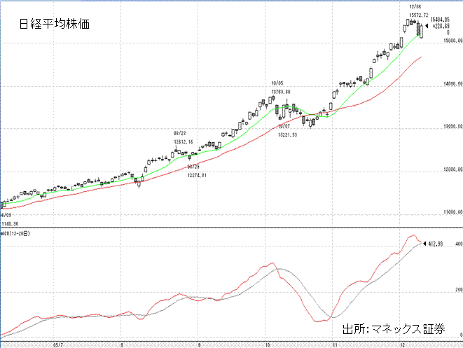 上の図の、日経平均株価とMACDを見てください。