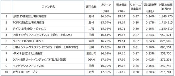 やはりメジャーな指数である日経平均株価やTOPIX(東証株価指数)をベンチマークとしたファンドが上位にきています。