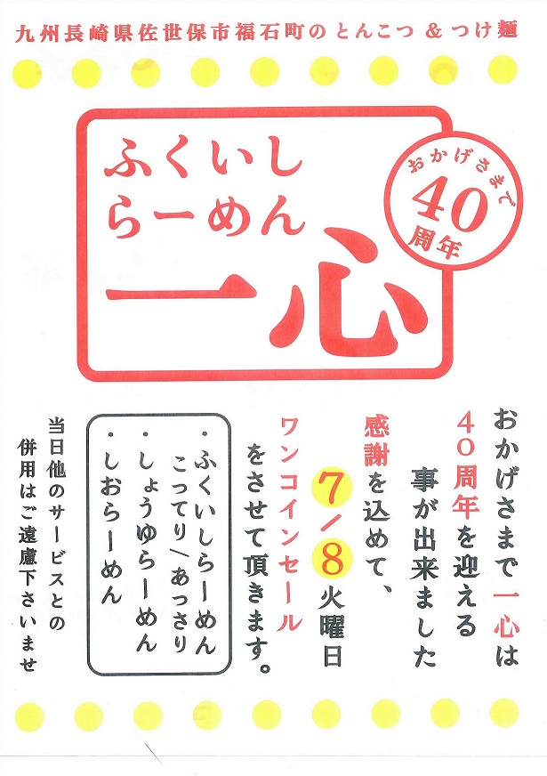 女将さんと、「40周年、すごいですねえ〜」とかなんとかっちゅう話しをしましたが、先代(お父様)が長崎県佐世保市福石町出身ということで、メインメニューはふくいしラーメンとのこと。知らなんだ。