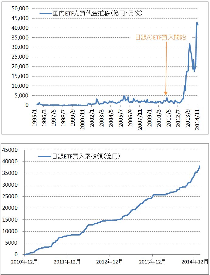 ここ最近、このレバレッジ型ETFの売買高が、ずっと東証売買高の1位となっています。売買高1位は個別株も含めてのものです。 売買コストが低く、パフォーマンスが日経平均株価の2倍となるETFは、便利だし分かりやすいし、流動性は確保されているし、プロが見てもなるほど良いインストルメントだなと思います。 ということで、あれよあれよと言う間に、ETF全体の売買高も月間4兆円を超えるようになりました。日次では2千億円くらいでしょうか。 出来高が急増したのは2013年に入って、日本株が暴騰したことがありますが、暴騰後も順調に売買高が増えています。 意味するところは、ETFプレーヤーが増えたのか、取扱金額が増えてきたのか、両方なのか・・・。 あわせて日銀もずっと買ってきてますから、何か安心感があるのかもしれません。 不況の株高、転じてデフレの株高ですが、トレンドはこのまま右肩上がりで行ってほしいものです。 *\(^o^)/* 不況の株高、デフレの株高 それぞれの指数はライブです。