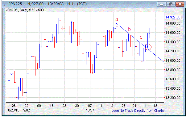 225の本格上昇が始まっている。 図にあるように、a-b-cという3つの下降するトレンドラインを適格にブレイクした。 この場合のデマークブレイクはトレンドラインを抜けて始値がスタートし、そこから1テイッィク以上上昇するというものである。 単純であるが、非常に有効なブレイクアウトであった。