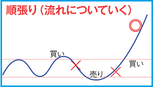 ポイントは「手仕舞い」 「売買の種類」というと、例えば「FX」だったり「株」だったり…… そういった“売買対象”よりも、「具体的にどんな売買を実行するか」が重要です。 ウォーレン・バフェット氏は、非常に長いスパンで株価の変化を考えます。 「今週は儲かった」とか、そういう感覚はないはずです。 では、うねり取りは? 数カ月単位の上げ下げを見ているので、デイトレードほど短くはありませんが、「資産を築く」というよりも「生活費を稼ぐ」売買といえるでしょう。 また、多くの人が「逆張りであるべき」と考えますが、逆張りが美しく理想的、順張りは雑で好ましくない──単純にこう考えるのは誤りです。 番組では、この2つの図を使い、プロの発想、プロの捉え方を紹介しました。 実は、多くの人が想像する逆張りは間違いで、どちらかというと「順張りが標準」といえるのです。 いったい、どういうこと? 詳しくは番組をご覧ください。 → うねり取り練習帖 第7回 じっせんの「ん」 うねり取りの道具