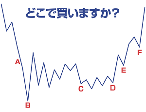 正解・不正解の判定は難しい 逆張りがプロの技、順張りは素人のダメ売買……こんな認識もあるようですが、まったくちがいます! そもそも、具体的にどんな売買を逆張りと呼ぶのか、順張りとはどう定義づけられるのか。 誰にも明日の株価さえわからないのだから、カンタンに「よい」「わるい」などといえないのが相場の世界です。 儲けるためには「安く買って高く売る」といわれますが、本当にこれが通用するのでしょうか? 下の図は、番組の中で示したクイズです。 まだ見ていない人は、「どこで買いますか?」という漠然な問いに、自分なりに答えてみてください。 すでに見た人は、あらためて考えてみてください。 詳しくは番組をご覧ください。 → うねり取り練習帖 第11回 うねり取りの「と」 順張りか逆張りか