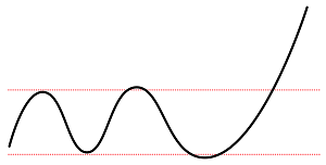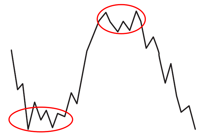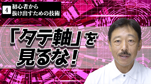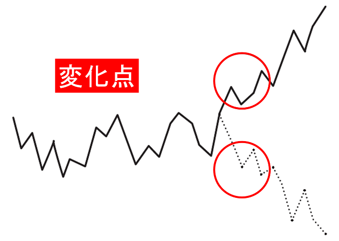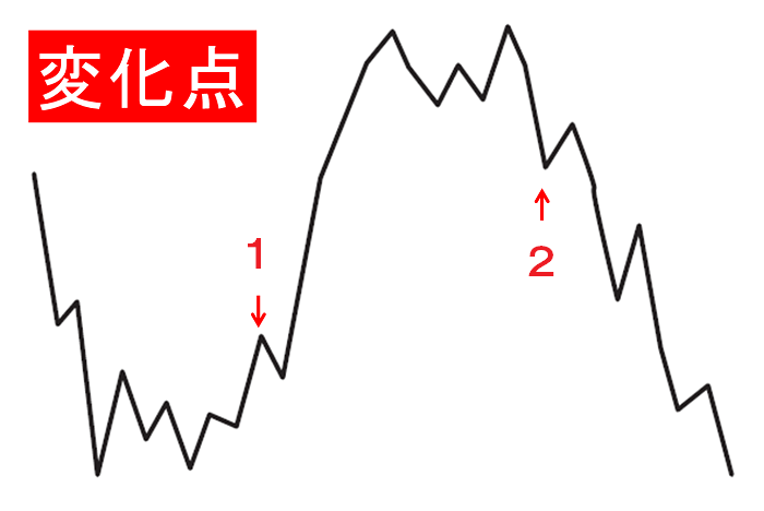 「見るな」なんて否定形、禁止形はよろしくありません。 私たち生身の人間は、素直に聞くことができないのです。 タテ軸とはチャートにおける「価格」です。 つまり「価格を見るな」ということですが、その意味は…… 天底を当てようとするよりも、いわゆる「変化点」を見つけようとするほうがラクですよ! やっと肯定形になりました。 では、話を進めます。 最初に、「チャートとはなにか」という理屈を、簡潔に述べます。 チャートは、2つの要素で成り立っています。 タテ軸の「価格」とヨコ軸の「時間」、この2つで成立する“2次元”の情報です。 損益を決めるのは価格だ──こう考えてしまうので、ついタテ軸の価格を強く意識するのですが、2つの要素を等しく扱うのが正しい、といえます。 こんな理屈を並べずとも、そもそもチャートを見なくても、ヨコ軸の「時間」が重要だと説明できます。 例えば500円で買った株が600円に値上がりしたとします。 これだけを聞けば、成功例だと思うでしょうが、なにげなく想像したとおり数カ月の変化ではなく、この2割値上がりに10年かかっていたら、「えっ、もっといいやり方があったのでは?」と感じるはずです。 やはり、時間は重要です。 では、チャートを観察するときに、「見るな!」と言ったタテ軸に目が向いている状況とは? 下の値動き図をご覧ください。 心理的に、丸で囲んだ安値圏と高値圏に目が向きます。 「ここで買いたい」「ここで売りたい」と、自然に考えるのです。 これが、タテ軸(価格)に目を向けすぎている状態です。 実際は、これら安値圏、高値圏にいる段階では、これから上がる(下がる)ことがわかりません。もちろん、「あそこが安値圏で買い場だった」と完全に確認できるのは、上がって、天井を打って、下がったあとです。でも、動きはじめたときには「トレンドが変わったようだ」と感じ取ることが可能です。 そのタイミングが変化点です。 同じチャートで、その変化点を示すと、下のとおりです。 安値圏にいるときは疑心暗鬼でも、「1」の段階では「上げに転じたようだ」と感じます。 同じように、高値圏で往来しているだけでは、上げ止まっているか否かを強く感じることはできませんが、ズルッときて「2」に至ると、「あっ、下げに転じたっぽいな」と思うでしょう。 これら変化点で、それぞれ買う、売る、つまり一歩遅れで値動きに“ついていく”売買が、実は最も素直な対応です。 でも、安く買ったほうがいいので、変化点「1」に至る前に、少し頑張って、少しリスクを取って仕込むやり方もあります。いわゆる「逆張り」です。 ちなみに、ガンガン下がっている最中に目をつぶって買うのは、逆張りでもなんでもなく、単なるイチかバチかの乱暴な買い方です。 高値圏はどうでしょうか? 変化点「2」の段階で、「相場はおわったか」と買いポジションを売り手仕舞いする、あるいは、それ以降の下げを取るべくカラ売りを仕掛ける──こんなタイミングでいいのです。 もちろん、上げていく勢いのあるうちに手仕舞い売りをスタートし、高値保合のなかで徐々にドテン売り越していく、というカッコいい売買が理想です。 ただ、買いの仕掛けもカラ売りの仕掛けも、見据えるのは「その後の値上がり(値下がり)」です。過去と比べて安くなった(高くなった)ことは関係なく、『ポジションを取ったあと、どう動くか』だけを考えるはずです。 こうして状況を整理すると、変化点「1」で買う、変化点「2」で売る、といった順張りの対応がダメなことではなく、むしろ素直で正しいと納得してもらえると思うのです。 ダメ押しの事例を、追加で示します。 こんどは、「天井」「底」という捉え方ができない値動きです。 途中までは方向感のない上げ下げ、いわゆる「保合」(もちあい)です。 これこそ、「変化点をさぐる」感覚が必要なケースです。 「安く買う」という表現にとらわれると、買い場は限定されてしまいます。 現実の相場のなかで、出動するチャンスを見つけるのが困難です。 例えば、300円の安値にいた銘柄が600円になったとします。 すでに倍化しているのですが、「勢いがある」「今の市況で上がるなら、こういった銘柄だろう」といった分析で、さらなる値上がりを狙う買い出動も“あり”でしょう。 その際、チャートのタテ軸だけでなく、「600円まで上がったが、現在の値運びを見ると上にいくと感じられる」といった観察、つまり、タテ軸とヨコ軸を等しく扱う姿勢だと思います。 あるいは、「保合を上に抜けたら飛び乗ろう」という狙い方もあるでしょう。 まさしく変化点に目を向けた、順張りのエントリーです。 冒頭でも触れたとおり、チャートはたった2つの要素で成立しています。 このうちの1つをおろそかにしたら、バランスがわるくなってしまいます。 タテ軸の「価格」だけでなく、ヨコ軸の「時間」にも目を向けることで、最も大切な『トレンド』を見ます。そうすることによっ