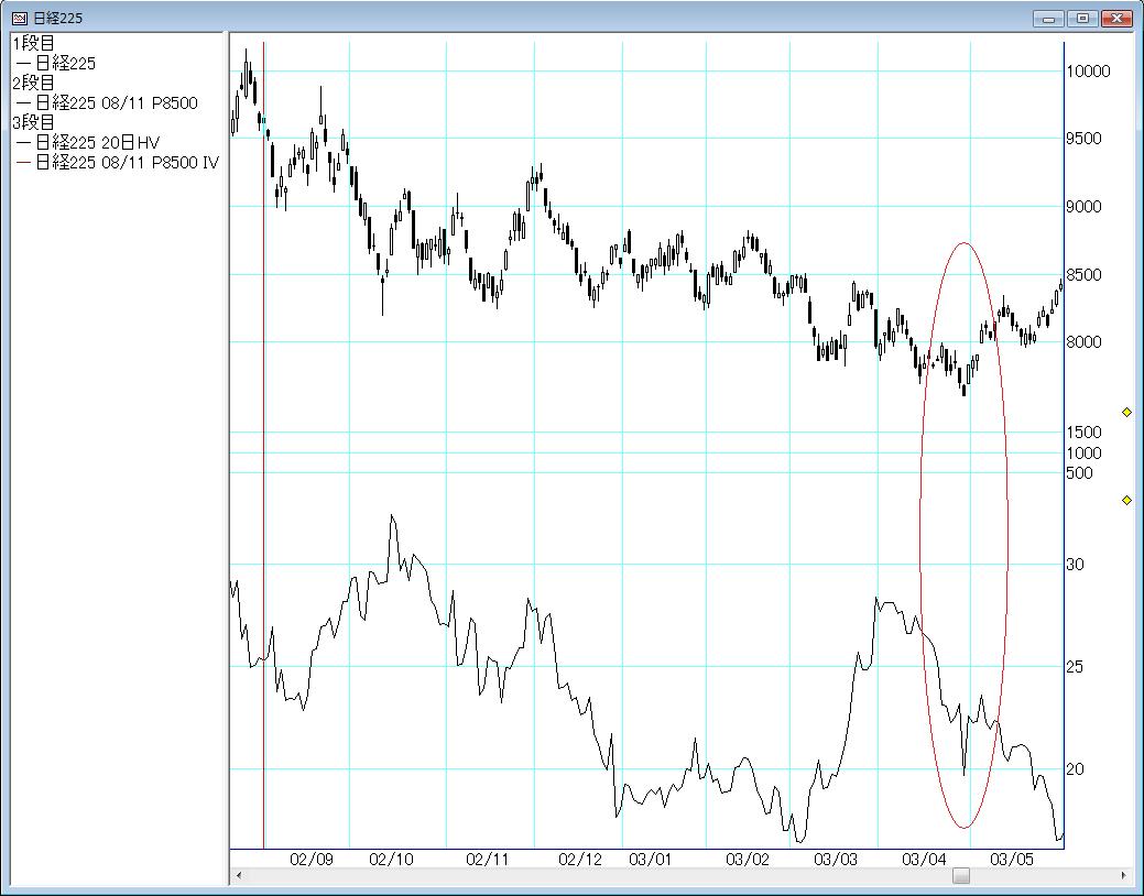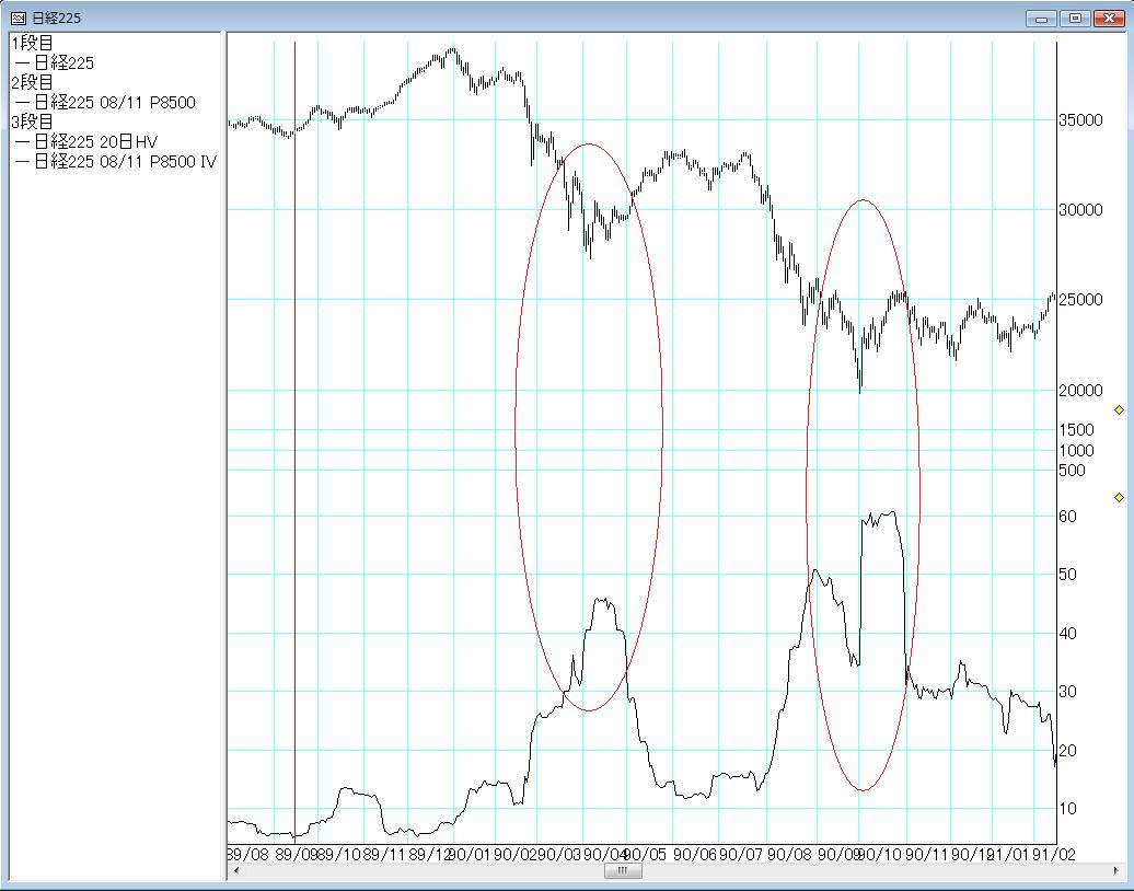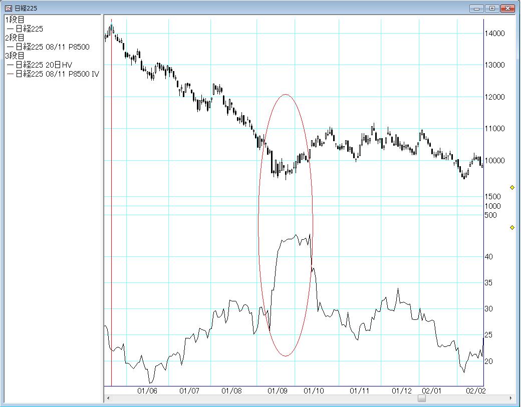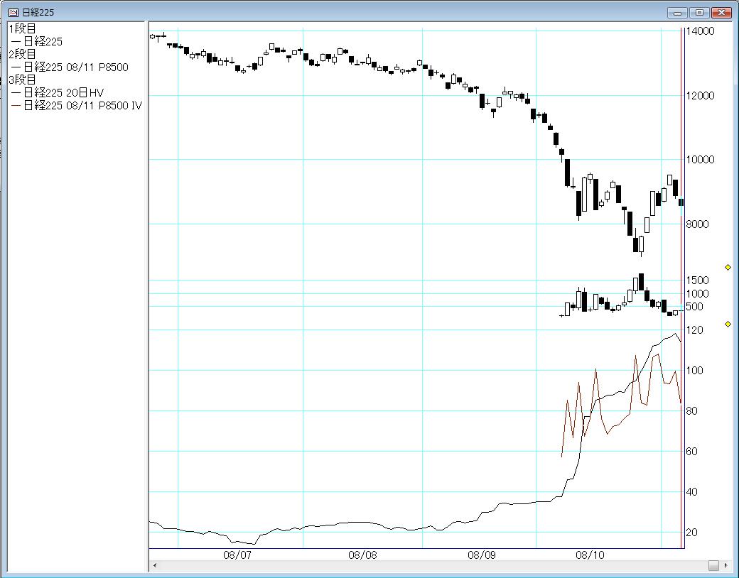 市場は落ち着きを取り戻してきたようですが。。。 今ATMの850プット11月限のIVは82%もありますね。 20日で計算したHVは113%。。。。 ボラティリティが年率100%ってすごいですよね。 今後一年間で、株価指数が2倍になるか半分になるかって水準のボラティリティです。 私の経験してきた市場では、225のボラティリティは20%〜30%の水準でしたので、まさに驚きです。 チャートギャラリーで遡って、過去のボラティリティの水準を調べてみました。 2003年の日経平均8000円割れのときは、ボラティリティは30%程度です。 2001年の9・11テロのときのボラティリティは40%程度です。 このときは大証が停止になって、IVでは50%いってた記憶があります。 1989年の日経平均39000円から20000円へのバブル崩壊過程でもボラティリティは60%くらいです。 いかに今回のクラッシュが凄いかおわかりになると思います。 愛読書の『ゾーン』の教えに 「何事も起こりうる」というのがありますが、本当に何事も起こりうりますね。 マーケットってすごいッス。