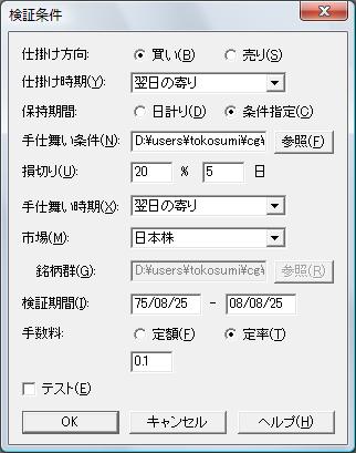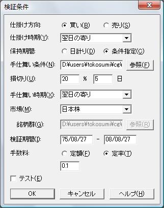 流動性のある銘柄に絞るために出来高を100万株以上の株に絞ってテストしてみます。 チャートギャラリーでは1000株単位で計算されるので、出来高を1000より大きいとします。 具体的な条件式は以下のとおり 買いにチェックを入れて 損切20% 5日保有にして 手仕舞いは、条件を満たしたあとの寄付 日本株4000銘柄を対象とします 検証期間は1975年8月25日から2008年8月25日 なんと30年以上! これだけの長い期間を検証する人はあまりいないでしょう。 超長期の検証は、私はかなり重視しています。 手数料を約定代金の0.1%とします。 で、結果は、プラスのバイアスはあるのがわかるって程度の感じです。 このままでは使えないので、何らか手直しが必要みたいです(^^; それは、また明日w