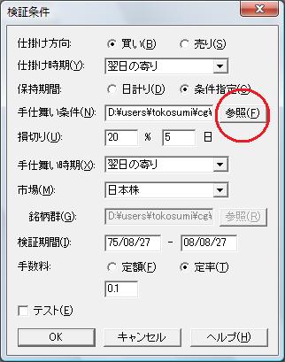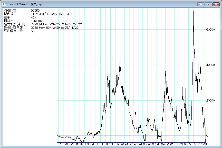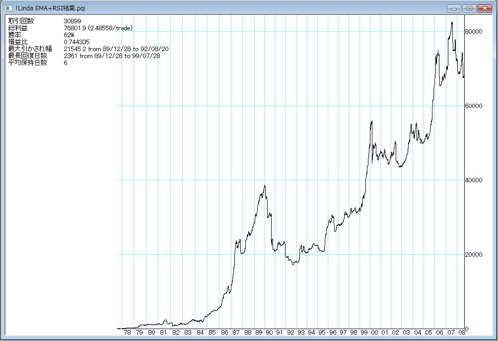 手仕舞いのルールを考えてみます。 これまでは、20%の損切と5日後手仕舞いだったけど、RSIが10%で仕掛けにしてるので、手仕舞いはRSIがニュートラルに戻ったらにします。 RSIが50%に戻ってきたら手仕舞いというわけです。 手仕舞いルールはこんな感じ。 F8のシステム実行を押して、参照ボタンをクリック。 今作って保存しておいたRSI手仕舞いを選択して、 買いは翌日の寄り 損切20% 5日間 手仕舞い時期も翌日の寄り。 対象銘柄は、日本株全部。 1975年から30年間。 手数料は0.1% 仕掛けも手仕舞いも寄付き限定にしてるので、サラリーマンでも主婦でもできます。 で、結果は、 あ、これリンダのルールじゃないですからね。 私が勝手に改良?してるだけです。 正しいリンダのルールは『魔術師たちのトレーディングモデル』を参照して下さい。 で、成績統計値の読み方を、まだ書いてなかったですが、 取引回数は誰でも分かると思います。 総利益は、これは1000株単位で表示されてます。 今の画面だと、76801.9と表示されてますが、30年間で7万6千円じゃないです(笑)。 これの1000倍の76,801,900円と読んで下さいね。 隣のカッコの中の数値は1トレード当たりの平均損益です。 期待値ともいいます。 これも2.48558円ではなく、1000倍の2,485.58円 約2500円の利益と読んでください。 勝ったトレードも負けたトレードも全部合わせて合計して、取引回数で割ったら2500円だったということです。 手数料を抜いて2500円だったら、そんなに悪くないですね。 1回トレードする度に、平均で2500円儲かるわけですからね。 でも、ドローダウンがでかいですね。 カーブがもっと滑らかでより直線的だといいのですけどね。。。 実際に運用したら、精神的苦痛の連続だと思いますw 私のDVDで紹介してるシステムも手数料引き後で平均2000円くらいの利益なのですが、その代わり滑らかです。 より安定して2000円儲かる確率が高いということですね。 興味がある人は、見てみてください。