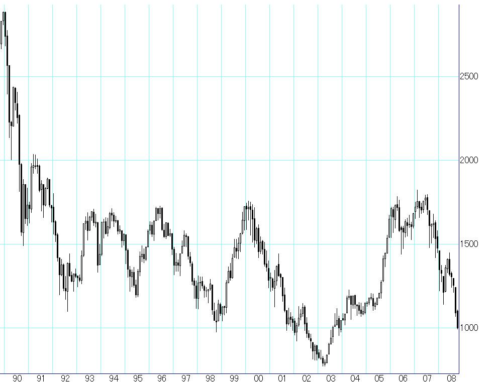 株の暴落が激しいですね。 昨日はTOPIXが1,000ポイント割れしました。 日経平均株価も10,500円割れで、1万円割れも視野に入ってきた感じです。 今朝のシカゴが10,095円なので。。。。 月足の長期チャートを載せておきます。 下落の目処のご参考に。 日経平均月足 TOPIX月足