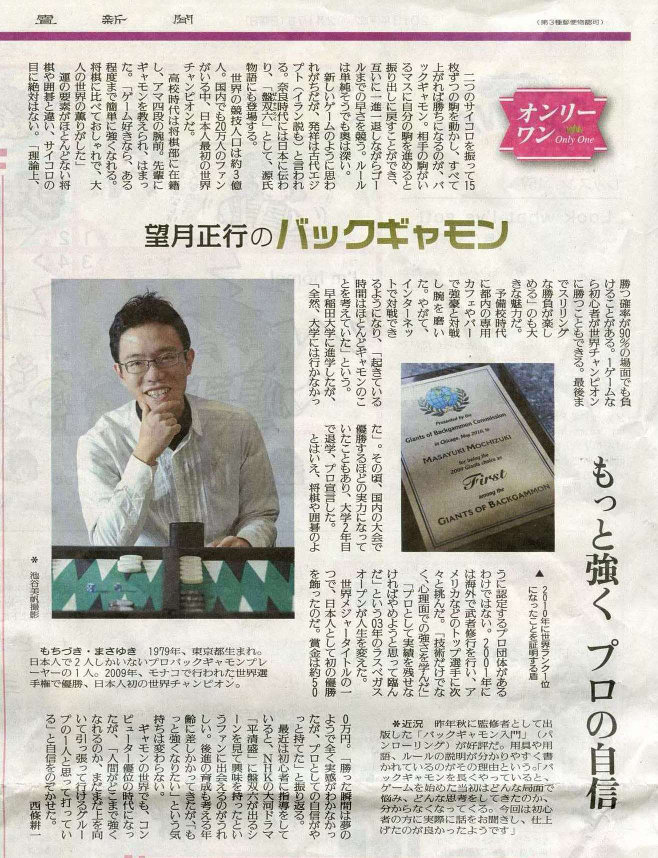 News 2013年2月17日付の読売新聞5面に、本書の監修者でプロバックギャモンプレイヤーである望月正行氏の記事が 掲載されました。
