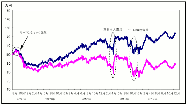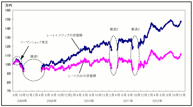 ¿Þ1.2.1¡¡2008ǯ£¸·î¡Á 2012ǯ11·î¤Þ¤Ç¤Î±¿ÍÑÀ®ÀÓ (19¥Ú¡¼¥¸¤ÎºÇ¿·ÈÇ¡Ë ·ãư¤Î»þ´ü¤Ç¤âÊ¿¶ÑÇ¯Íø10¡ó¤Ï³ÎÊݤ·¤Æ¤¤¤Þ¤¹¡£ ¼ÂºÝ¤Ï100Ëü±ß¤Ç¤Ï¤¢¤ê¤Þ¤»¤ó¤¬¡¢Ê¬¤«¤ê¤ä¤¹¤¯100Ëü±ß¥¹¥¿¡¼¥È¤Ë¤·¤Æ¤¤¤Þ¤¹¡£ ÅÓÃæ¤Î¶õÇò´ü´Ö¤Ï¡¢¥ê¥¹¥¯¿äÄê¤Ë¤è¤Ã¤Æ·è¤á¤¿¥í¥¹¥«¥Ã¥È´ð½à¤Ë±è¤Ã¤ÆÅ±Âष¤¿Éôʬ¤Ç¤¹¡£ ¿äÄêÊýË¡¤ÏËܽñ¤Î¤Ê¤«¤Ç²òÀâ¡¢¥Ä¡¼¥ë¤ò¥À¥¦¥ó¥í¡¼¥É¤¹¤ì¤Ð´Êñ¤Ë»»½Ð¤Ç¤¤Þ¤¹¡£ ¿Þ1.2.5¡¡¥í¥¹¥«¥Ã¥È¤·¤Ê¤«¤Ã¤¿¾ì¹ç¤Î±¿ÍÑÀ®ÀÓ(24¥Ú¡¼¥¸¡Ë ¡Ö¤â¤·¥í¥¹¥«¥Ã¥È¤·¤Æ¤¤¤Ê¤«¤Ã¤¿¤é¡×¤òÁÛÄꤷ¤¿¥·¥ß¥å¥ì¡¼¥·¥ç¥ó¤Î¿Þ¤Ç¤¹¡£¥ê¡¼¥Þ¥ó¥·¥ç¥Ã¥¯¤äÅìÆüËÜÂç¿ÌºÒ¡¢¥æ¡¼¥í´íµ¡¤Ç¤â¥í¥¹¥«¥Ã¥È¤»¤º¡¢ÊüÃÖ¤·¤Æ¤¤¤¿¤é¡¢¤³¤Î¤è¤¦¤ÊÀ®ÀӤˤʤäƤ¤¤Þ¤·¤¿¡£ ºÇÂç20¡ó¶¯¤Î¥Þ¥¤¥Ê¥¹¤È¤Ê¤Ã¤Æ¤¤¤ë»þ´ü¤â¤¢¤ê¤Þ¤¹¤¬¡¢½çÄ´¤Ë²óÉü¤·¤Æ¤¤Æ¤¤¤Þ¤¹¡£