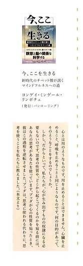 ミンゲールは珠玉の人物だ。偉大な瞑想の天才で、13歳のときに精神力でパニック障害を克服した。そして16歳という若さで指導者に任命された。『今ここを生きる』はミンゲールの素晴らしい人生の話を織り込んだ、瞑想についての見事な本だ。――* チャディー・メン・タン著 『サーチ・インサイド・ユアセルフ』より