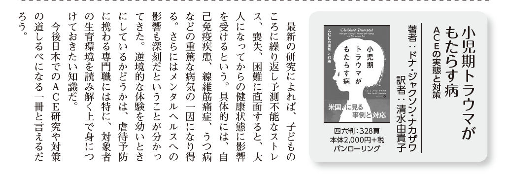 そうしたナカザワ氏の研究の集大成ともいえるのが本書である。小児期の経験が大人になってどのように影響するのかが、アメリカの複数の家庭の例を挙げながら解説されていく。日本でも逆境的体験を余儀なくされる子どもは多いが、アメリカでは深刻で痛ましい例が多く、研究も進んでいる。今後の日本でのACE研究と対策の道しるべになる1冊と言えるだろう。