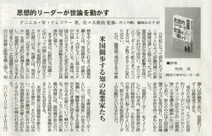 本書でダニエル・ドレズナーは、21世紀の言論市場を内側から観察し、私たちが現在の場所にたどりつくまでの足跡を描き出す。博覧強記の公共知識人とは対称的に、思想的リーダーはたった一つの思想を売り込むことで国民の注目を集める。「2025年までに世界から貧困をなくす」という例からもわかる通り、そのアイディアは壮大で非常に野心的だ。しかも彼らは、大学の教授や在野の知識人といった普段、高級誌で議論を交わしている知識層――いわゆる言論市場の「門番」を飛び越えて、政治家や役人、あるいは国民に、直接自分のアイディアを届けることに成功している。思想的リーダーがうまく批判を避けている一方で、今世紀に入ってから公共知識人による批判の影響力は落ちている。