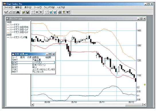 このような売買条件を定義し、ファイルに保存でき、毎日簡単に実行できます。なお、『ボリンジャーバンド入門』の指標を チャートギャラリープロで表示させるには以下の手順が必要です。