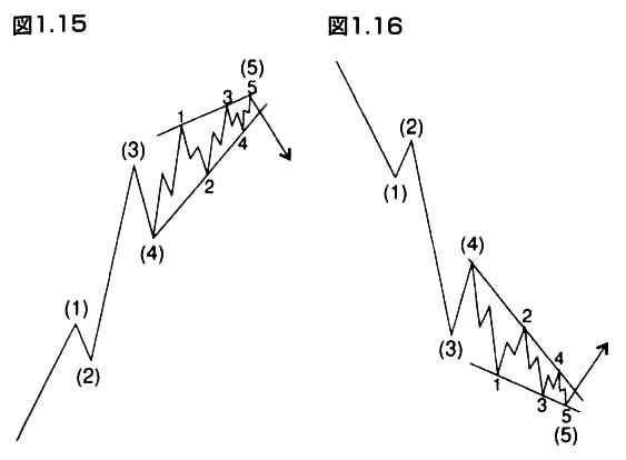 エンディング・ダイアゴナルトライアングルは相場の天井や底となることが多く、パターン完成後には鋭い戻しが続くことが多い。(3)リーディング・ダイアゴナルトライアングル