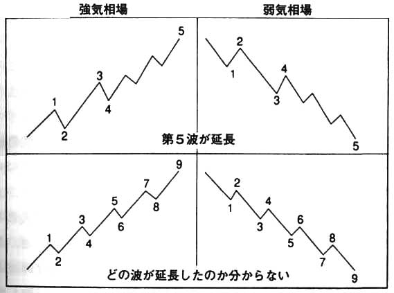 株式相場では、「一般に最も延長する波は第3波」である。この事実は衝撃波の2つのルール(すなわち、第3波はけっして最短のアクション波とはならない、第4波は第1波と重複しない)に照らして考えると、リアルタイムの波の解釈にとってとりわけ重要である。