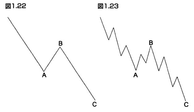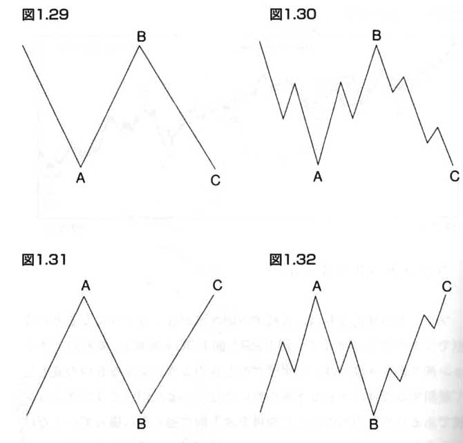 弱気相場でもこうしたパターンは同じであるが、その形は強気相場とは逆になる。