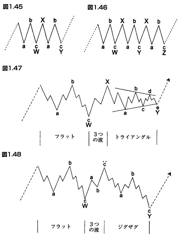 エリオットは横ばいの複合型パターンのうち、2つから成る修正パターンを「ダブルスリー」、3つから成る修正パターンを「トリプルスリー」と呼んでいる。シングルのスリーはジグザグやフラットであるが、トライアングルはそうした複合型修正パターンの許容される最後の部分であり、こうしたコンテクストから「スリー」とも呼ばれる。複合型はジグザグ、フラットやトライアングルを含むより単純な修正のタイプで構成されている。それらが出現するのは、延長された横ばいの動きによるフラットな修正局面であるようだ。ダブルジグザグとトリプルジグザグについては、単純な修正パターンの部分はW、Y、Zと表記される。Xで表される各リアクション波は修正パターンの形をしているが、一般にはほとんどジグザグである。