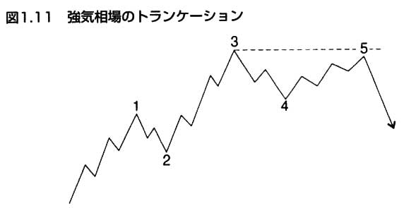 第5波が第3波の終点を超えられない状況を「トランケーション=切頭」または「切頭された第5波」という 。図1.11と図1.12にも示されているように、一般にトランケーションは予想される第5波に5つの必要な副次波が含まれることに気づけば確認できるだろう。こうしたトランケーションはときに、とりわけ強力な第3波のあとに出現する。