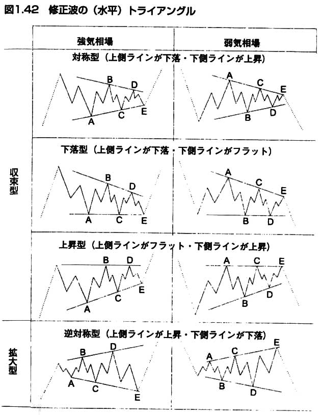トライアングルは売りと買いの力の均衡状態を反映しているようであり、通常では出来高の減少とボラティリティの低下を伴う横ばいの動きとなる。トライアングルのパターンには、3−3−3−3−3に細分され、A−B−C−D−Eと表記される重複的な波が含まれる。トライアングルはA波とC波、B波とD波の終点を線で結んだような形をしている。E波はAとCを結ぶラインに達しないこともあるし、そこを突き抜けることもある。 トライアングルには収束型と拡大型という2つの種類がある。さらに収束型トライアングルには、対称、上昇、下落の3つのタイプがある。収束型よりもまれにしか出現しない拡大型トライアングルには、こうした種類はない。拡大型トライアングルは常に図1.42に示したようにしか出現しないことから、エリオットはこの形を「逆対称」のトライアングルと名付けた。