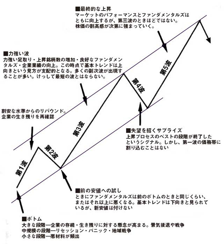 一般に第5波は上昇する銘柄数という点では、第3波ほどダイナミックではない。もしも第5波が延長し、第5波の副次的な第3波の動きが第3波より速いとしても、その最大のスピードは依然として第3波には及ばない。通常では第5波の出来高は第3波よりも少ない。相場の初心者はよく長期トレンドの最後に株価の「噴き上げ」を期待するが、ヒストリカルなデータを検証しても、相場のピークで株価が最も勢いよく上昇したというケースは見られない。たとえ第5波が延長しても、その副次的な第5波はそれ以前の波よりもダイナミックには上昇しない。第5波の進行中には、上昇する銘柄数が次第に減少するにもかかわらず、楽観的な見方がピークに達する。