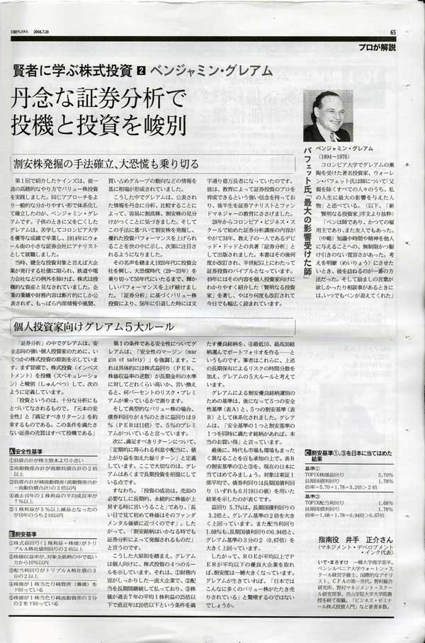![]() 日経ヴェリタス(2008年7月20日号)の『賢者に学ぶ株式投資』で、グレアムおよび『証券分析』について記載されています。 ←クリックいただくと、記事がご覧いただけます。 |
