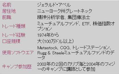 ジェリー(ジェラルド・アペル)は、世界でトップのパフォーマンスを誇るマネーマネジャーのひとりで、彼の頭は多くの人々が一生かかっても出せないような新しいアイデアを、1カ月のうちに生み出してしまうのである。ジェリーは1973年以降、自らの会社シグナラート・コーポレーションが発行するテクニカルニュースレター『システム・アンド・フォーキャスト(Systems and Forecasts)』の編集長を務めるほか、重要なマネーマネジャーでもあり、多くの著書も出版してきた。彼は、コンピューターを用いたテクニカル分析の時代に、MACD(移動平均収束拡散法)の開発者として名を上げた。MACDは、現在では大半の売買プログラムのなかに組み込まれている。