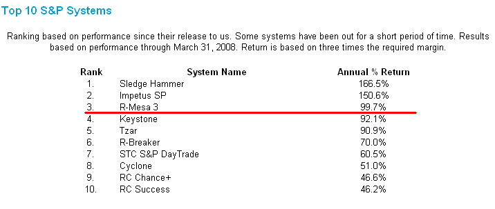 リリース以来、2008年3月31日までの世界ランキングリターンは証拠金の3倍に対する利回りで計算されている。手数料とスリッページで100ドルを控除している。