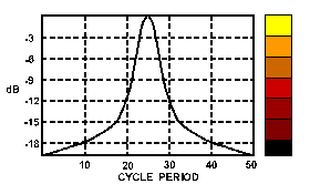図に示されるようにスペクトルの振幅を色に変換する。非常に集中している測定は黄色い線として表示されている。
