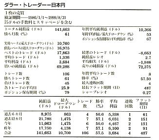 ・スタイルにはオプションの活用も含まれるが、このダラー・トレーダーは、われわれがこれまで見たなかでは最も一貫性を持ったシステムのひとつである。その最適化されない10のパラメータはすべての市場に共通である。このシステムを使うにはコンピューターと専用ソフトが必要である。