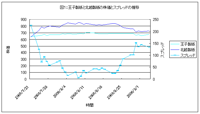 発表前日(7月21日)の北越の終値は635円、王子の終値は641円である。話を単純にするために、このとき10,000株ずつの株式を持っていたとしよう。7月23日王子はTOBを発表。そのときのTOB価格は860円。つまり、北越の株は王子の株の860/641=1.40倍の価値があると判断。北越株を1株買うと王子株を1.4株売ればよいことになる。または王子株を10,000株売り、北越株を7,000株買うことになる。24日の北越株はストップ高なので25日の終値でこれを実行するとする。この段階ではTOBは成立すると考えている。次に、23日の日経朝刊にはTOB不成立のニュースが出る。この日の終値で戦略を逆にする。TOB不成立にかけるのである。北越株をすべて売って王子株に乗り換える。ちょうど王子株を20,000株買うことができる。29日には王子は敗北宣言を出す。これを気にポートフォリオを元に戻す。30日の終値で取引すると王子株10,000株で北越株9,000株を買うことができる。