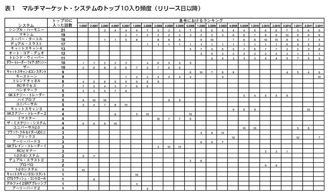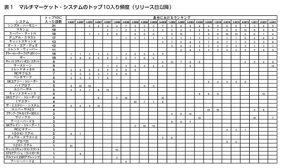 この表はマルチマーケット・システムが過去5年の間にトップ10に入った頻度を示している。シンプル・ハーモニーは21回もトップ10入りしている。この表を見ると、どの号ででトップ10に入っていないかも分かる。