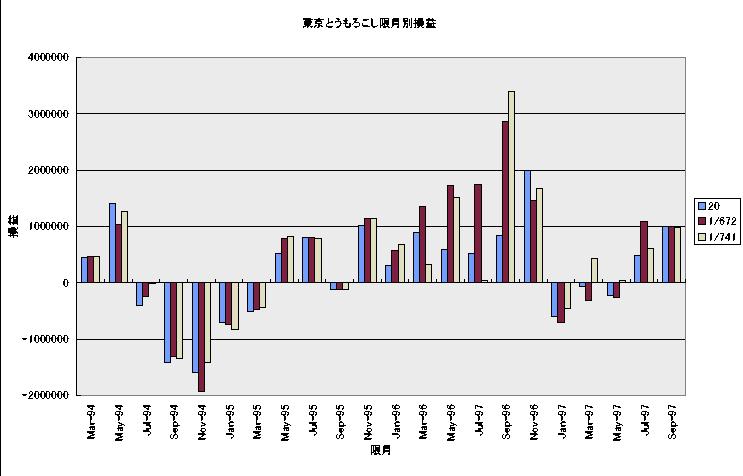 なお、刻ごとの新規建玉数の累計は、595 回 (20 円刻)、500 回 (1/672 刻)、 と 549 回 (1/741 刻) で、損益累計は 5,134,440 円 (20 円刻)、9,933,050 円 (1/672 刻)、と 9,557,930 円 (1/741 刻) であった。従って、一枚あたりの損 益は、8629 円 (20 円刻)、19866 円 (1/672 刻)、と 17409 円 (1/741 刻) で あった。