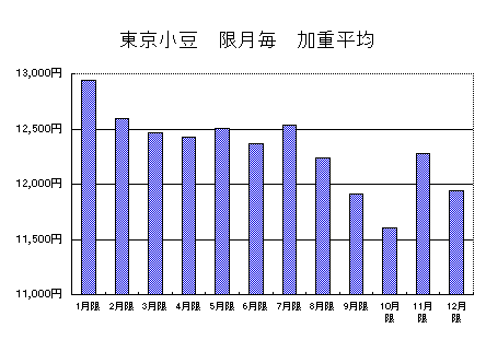 東京小豆の加重平均は01月限が一番高く、10月限が一番低い 天候相場の時期に存在する限月はボラティリティが高く 需給相場の時期に存在する限月はボラティリティが低い※加重平均について
