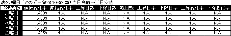 表2は一日の変動率の「曜日効果」をみることになります。一日の値幅変動率にはあまり差異がないことがわかります。