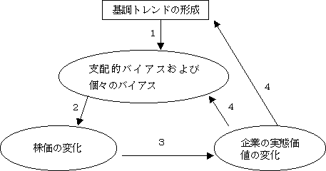 さらには、「潜在的トレンド」と「支配的バイアス」によって引き起こされた株価の変動は、参加者のバイアスと潜在トレンドの両方に影響を与える。