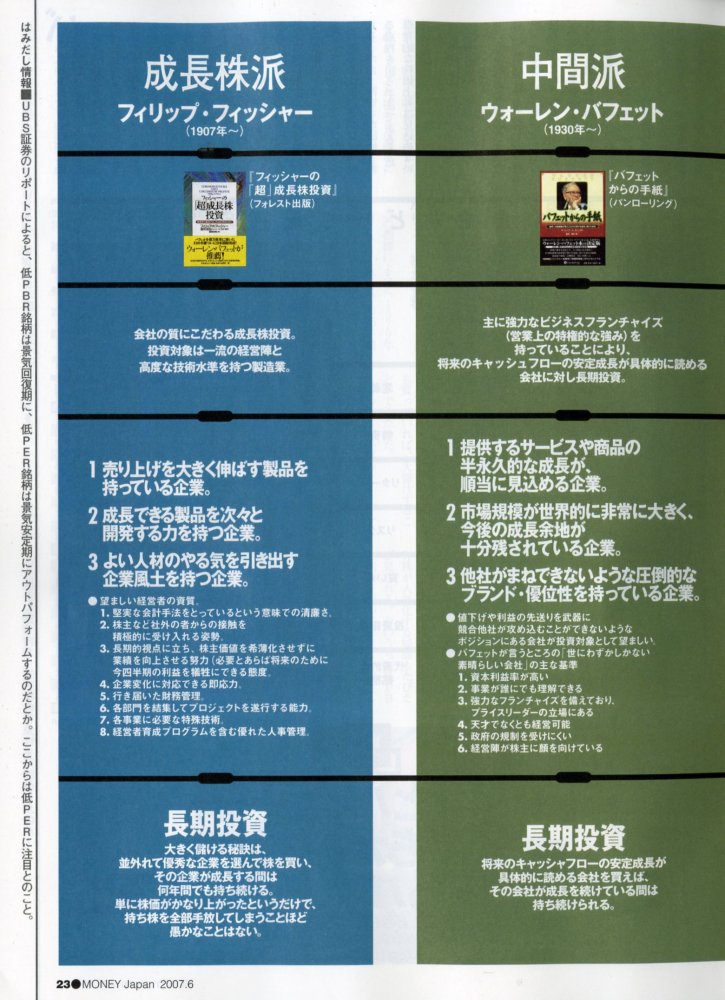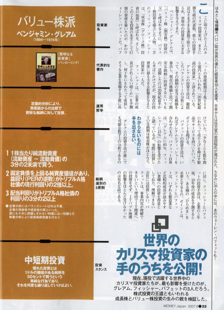 「世界のカリスマ投資家の手のうちを公開」にバリュー株派ベンジャミン・グレアムの代表的な著作『賢明なる投資家』が、中間派ウォーレン・バフェットの代表的な著作として『バフェットからの手紙』が掲載されました。