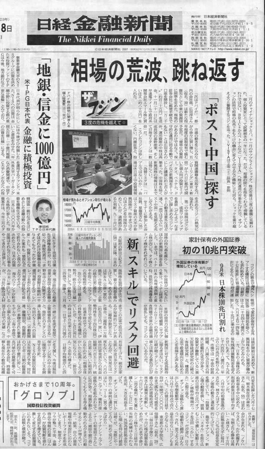2007年12月18日付の日経金融新聞 1面に「16日に都内で開いた個人向け投資セミナー。タイ、ベトナム、ドバイなど新興国をテーマにした講演に約700人が集まった。中国株を除く新興国株の情報は日本では得にくい」として、弊社主催の海外投資祭りが取材されました。