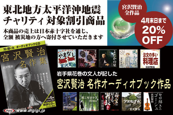 東北地方太平洋沖地震により被災された全ての皆様に心よりお見舞いを申し上げるとともに、犠牲になられました方のご冥福を、深くお祈り申し上げます。オーディオブック制作・販売のでじじは、岩手県花巻出生の文人宮沢賢治が遺した美しい物語、全11タイトルと全集のダウンロード版オーディオブックを4月末まで20%OFFといたします。対象オーディオブックをお聴きいただいた皆様のお気持ちは義援金として、日本赤十字社を通じ被災地の皆様に【全額】寄付させていただきます。