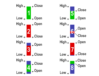 各バーは、寄値、高値、安値、終値の4本値で構成されている。