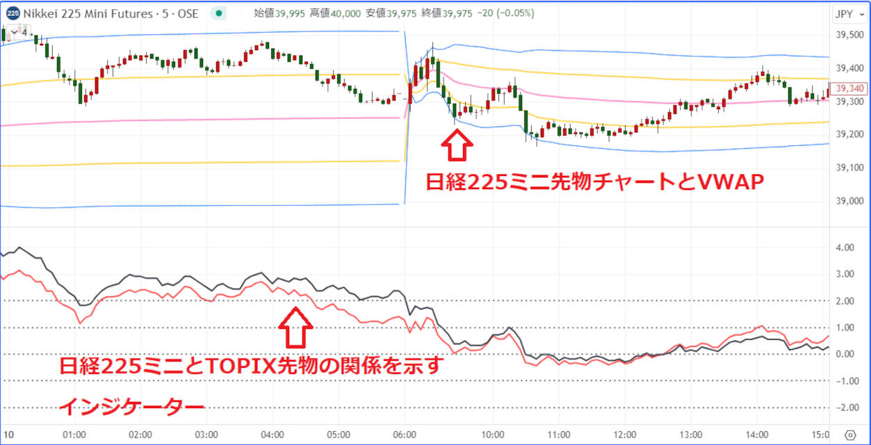 チャート図の下のインジケーターは日経225ミニ先物とTOPIX先物の動きを示しています(赤ライン:日経225、黒ライン:TOPIX)。