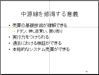 「応用編」では中源線を用いて実際にどう利益をあげるかという方法論を解説します。システム売買全体の考え方に始まり、銘柄選択、キザミの最適化といった各種ノウハウの伝授、個別株、商品先物、為替等の市場別の売買法をカバーする予定です。