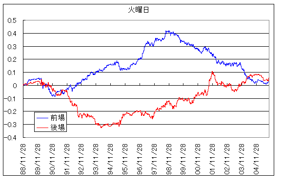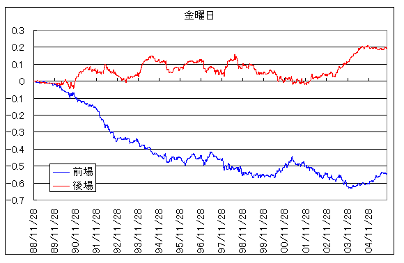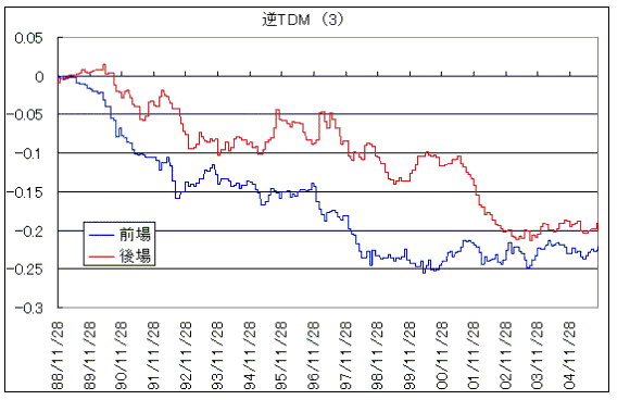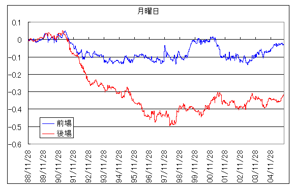 前場と後場はかなり異なる結果となった。水曜は前場と後場で逆に動きやすそうに見える。特徴的な傾向のあるのは、月曜の後場、木曜日、金曜日の前場は値段が下がりやすいということであろう。